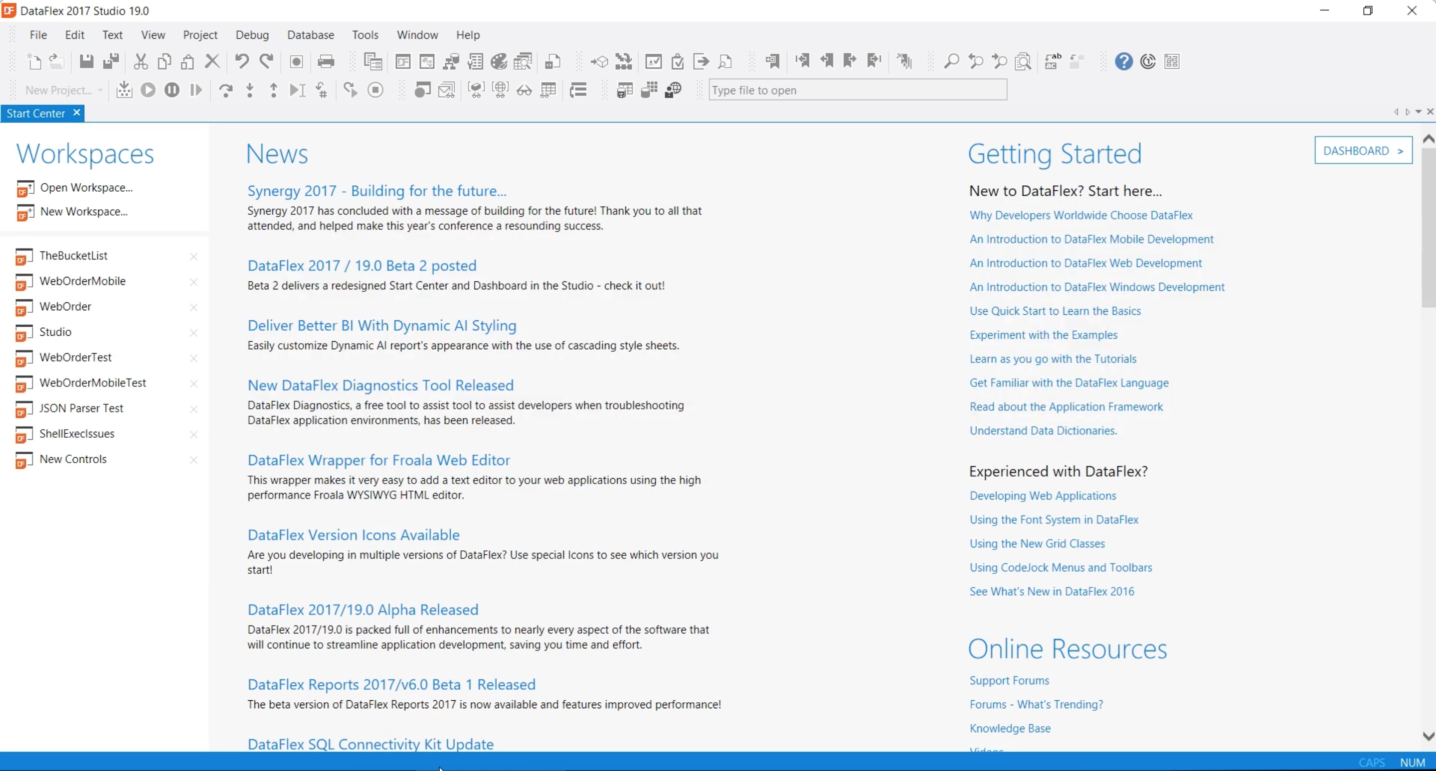 When you open the DataFlex Studio, the first thing you see is the Start Center. The Start Center gives you information on what’s new in the DataFlex world and it provides you an easy way to open recently used workspaces.