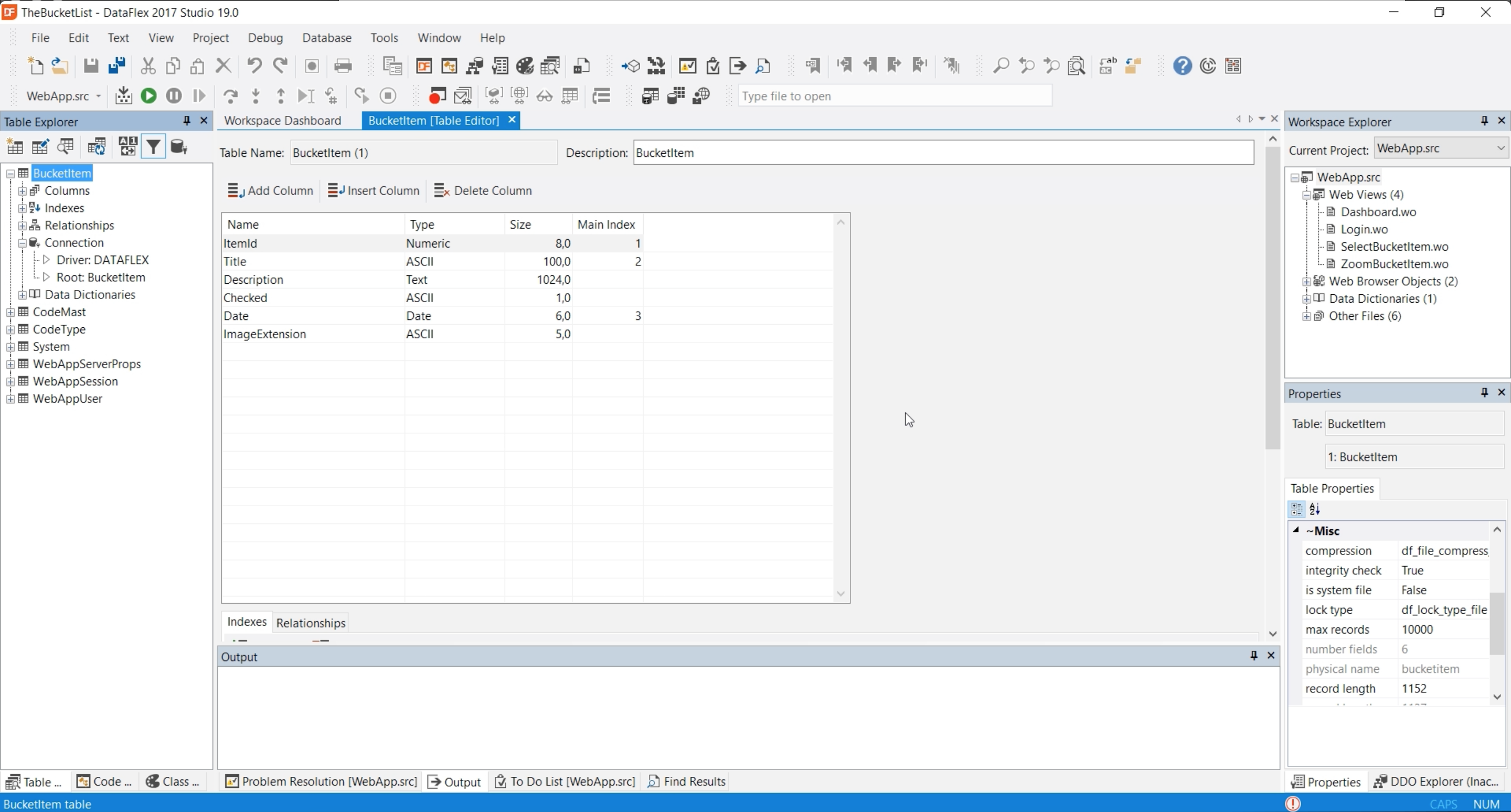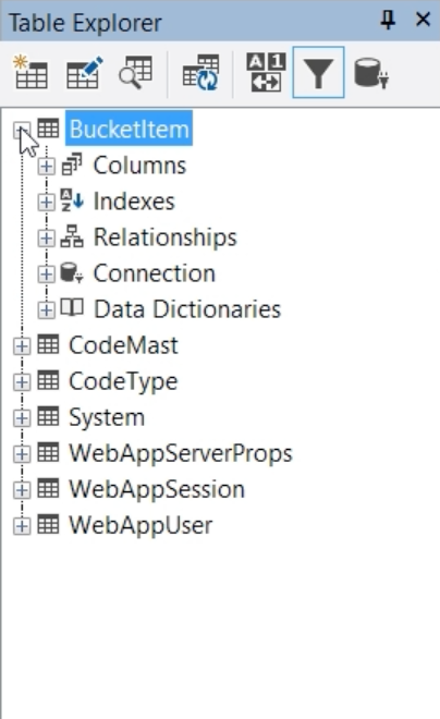 - Clicking on the table “BucketItem” expands it and shows more information like: Columns, indexes, relationships and connection.