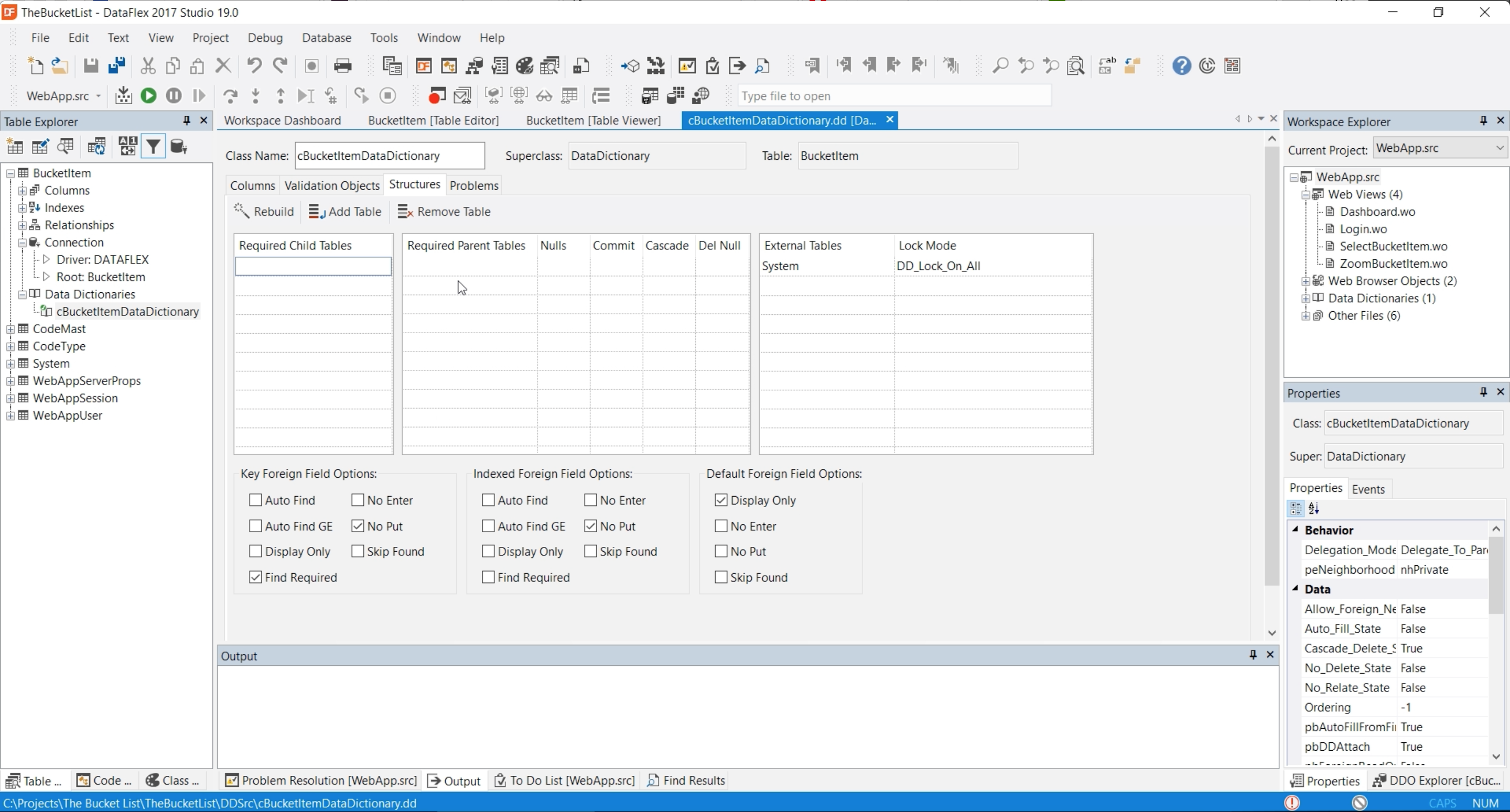 - A table can also have ‘Validation Objects’ and ‘Structures’. ‘Structures’ tells which other tables are required for saving this table. In this case it only shows the system table, which it needs for its auto numeric field.