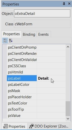 To customize the object, select it and use the properties panel. Here you can customize for example the name to ‘oExtraDetail’ and the label to Detail:.