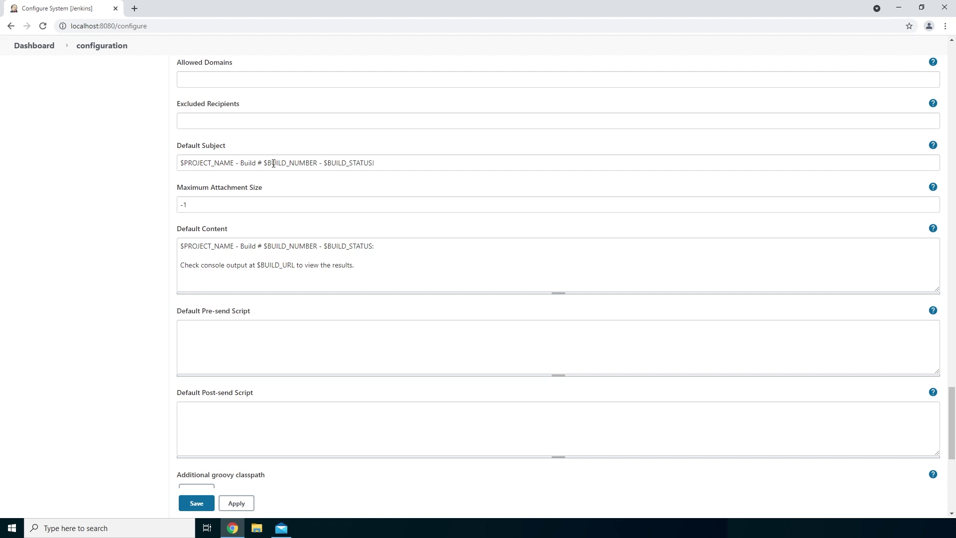 - If we scroll down a bit more we will see our default subject and content of the email. The Default Subject will show us the Project name, the build with the build number and the build status.