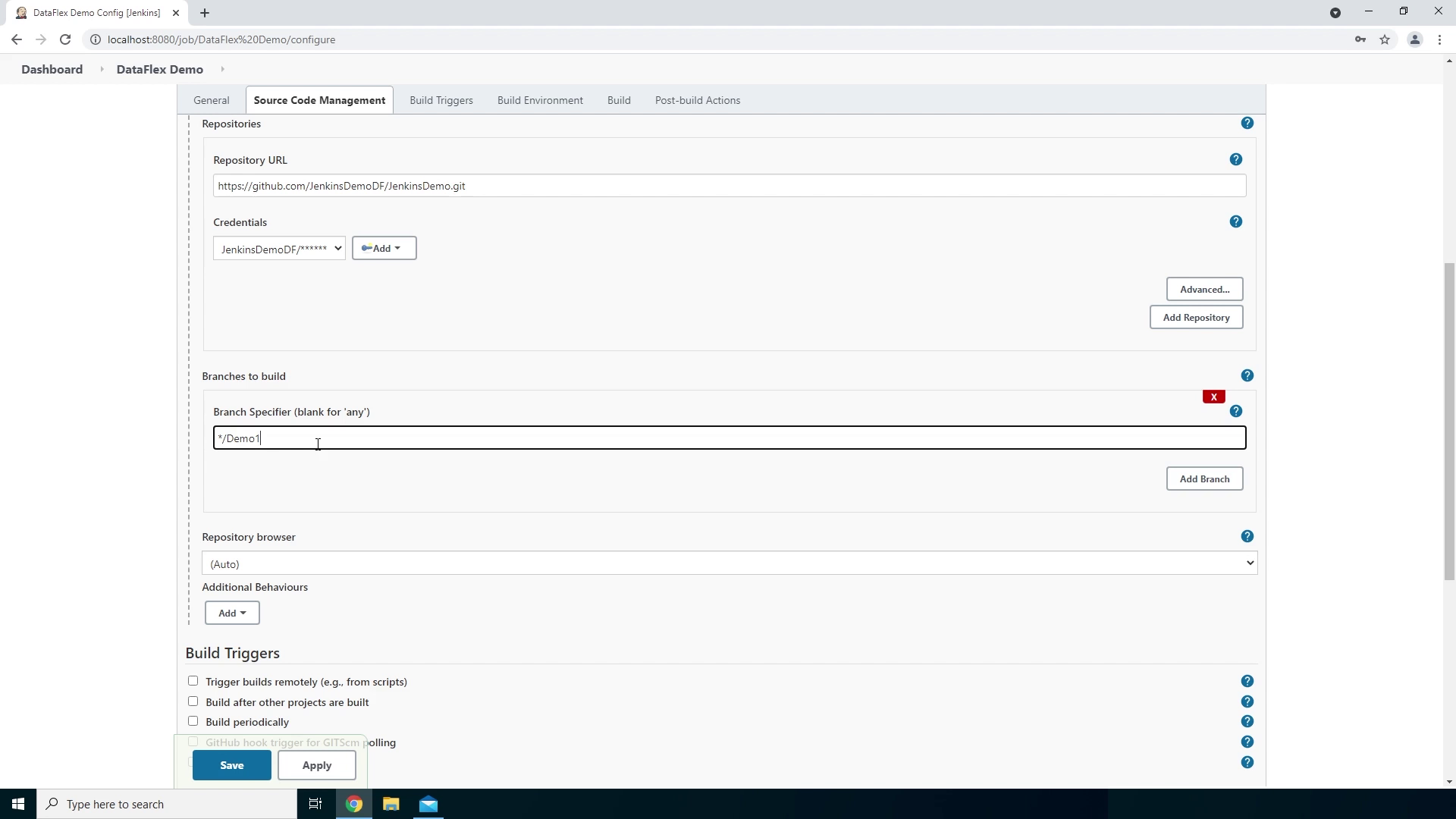 - So now we have added our credentials and we can select them in the dropdown box. Up next we can choose which branch we want to use. For this example we will use the Demo1 branch.