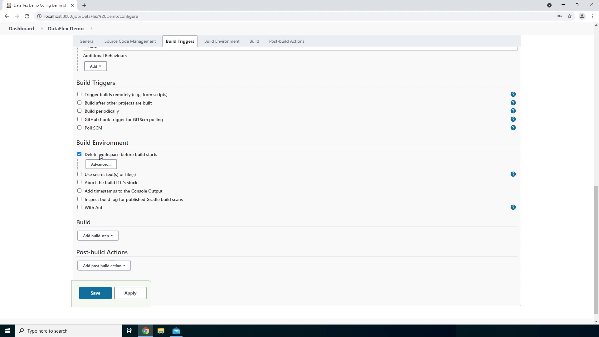 - The next thing we need to do is enable the Delete workspace before build starts option. We are going to do this because we want our workspace to be empty with each build when Git is fetching our repository.