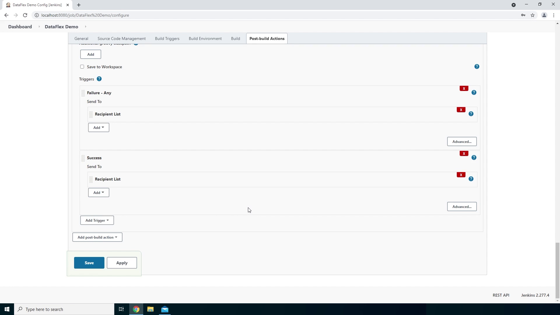 - Up next we can click on Advanced Settings to setup the email triggers. Here we select in which scenario we want an email to be sent. In this example we will sent an email on a successful and a failed build so let’s go ahead and add those. First we have to change the Send To list. We can remove the Developers and add the Recipient List we filled in earlier on.