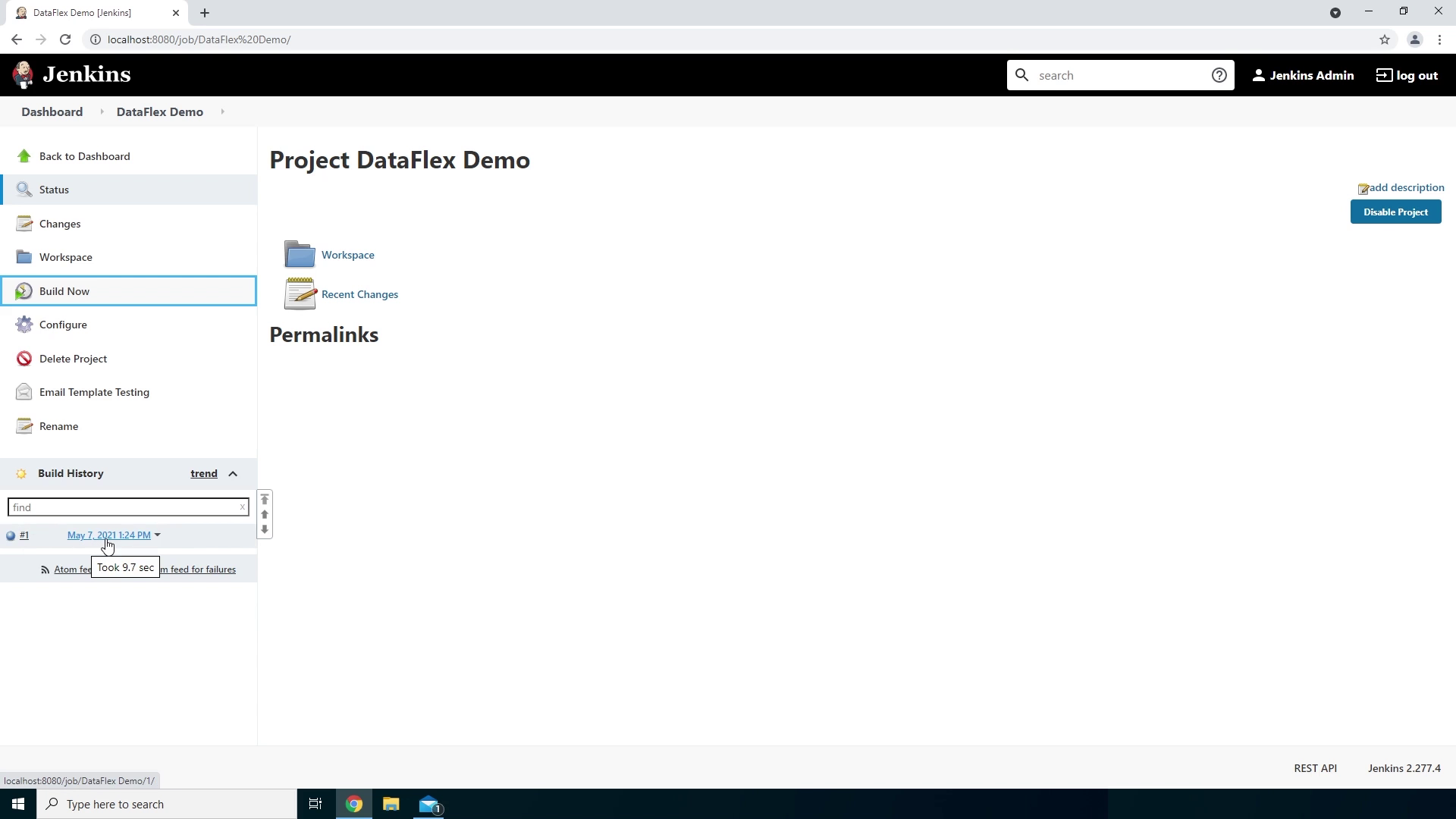 - Now we have everything setup to start our first build which will compile the JenkinsDemo workspace and then send us an email whether the build was successful or not.