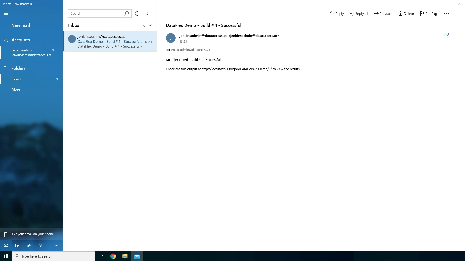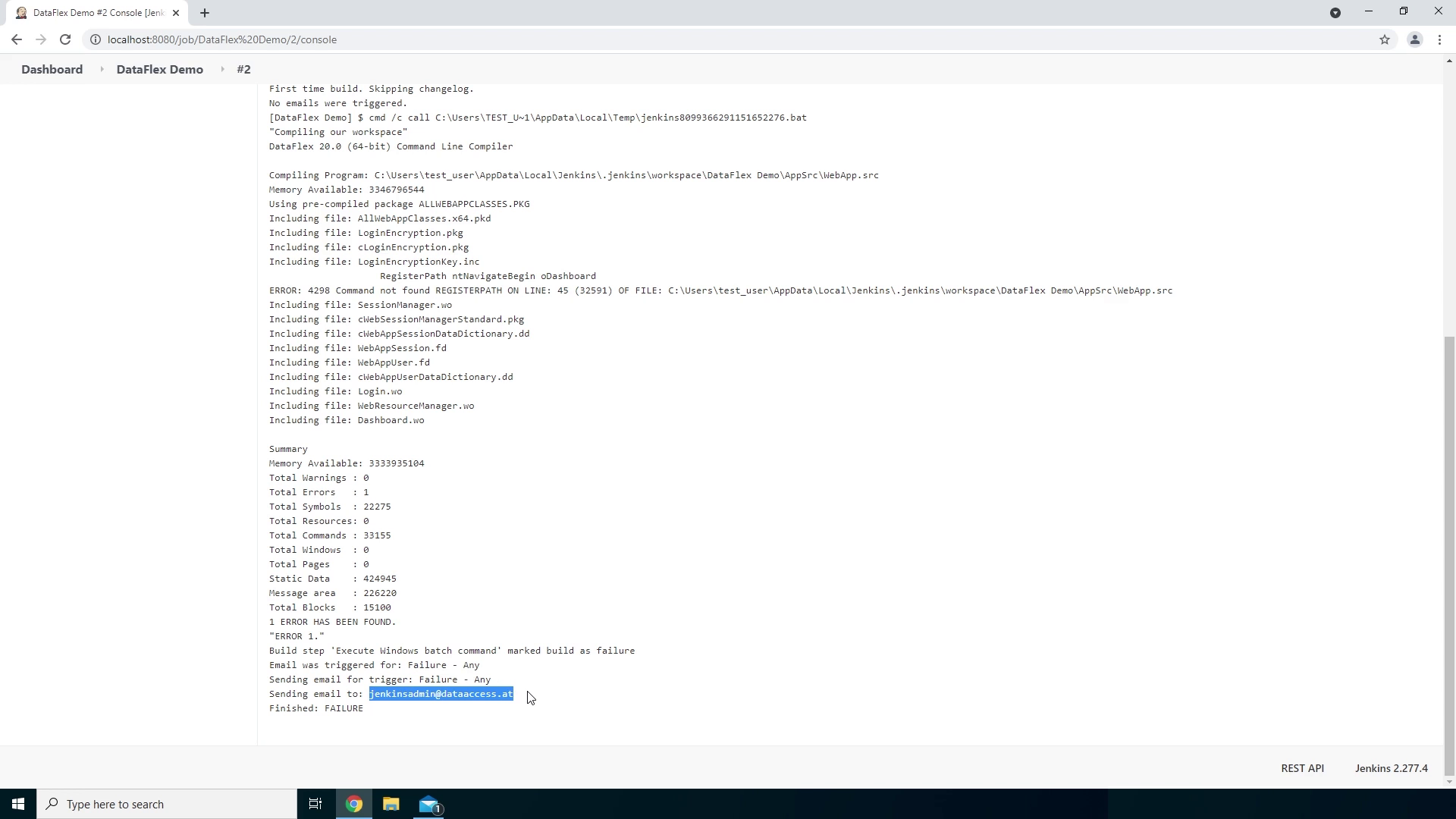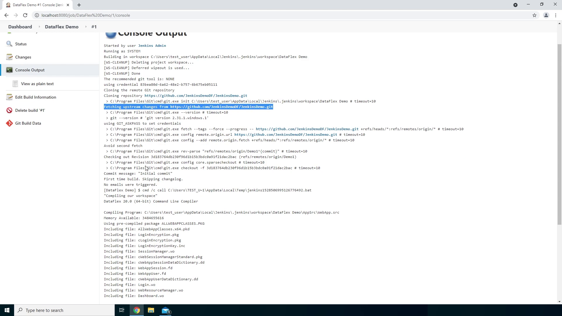 - Here we see it fetched our Git repository, then compiled our workspace using the DataFlex compiler and because it found no errors it triggered the Success email which has been sent to jenkinsadmin@dataaccess.at.