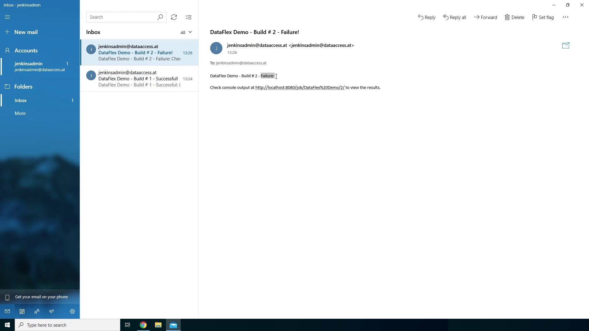 - Let’s check the build output by clicking on the build and then click on Console output. Now we see that the compiler has found 1 error and because of that it marked the build as Failed and has sent us an email saying it failed which has been sent to jenkinsadmin@dataaccess.at again. We can see we have received another email right here and it has been marked as a Failure.