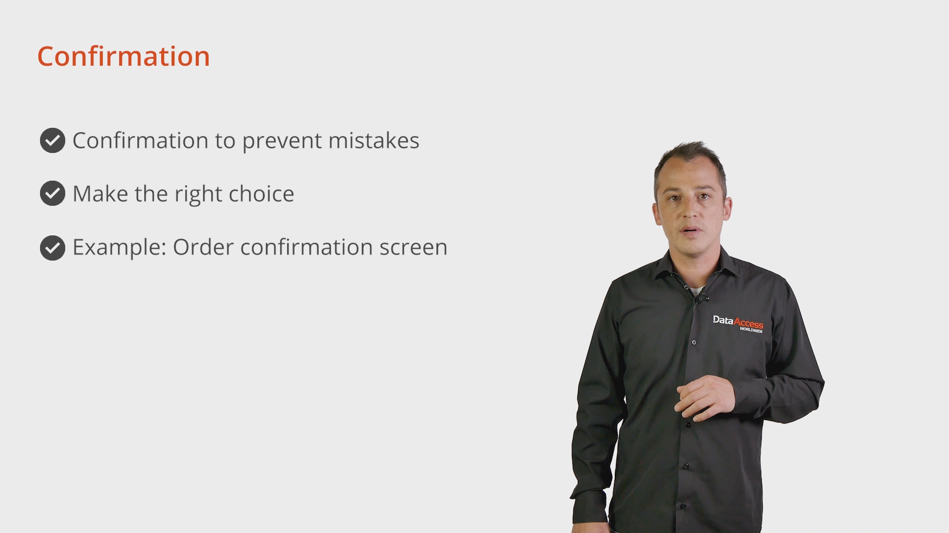 Preventing user errors is one of our key goals when creating an application. The principle of confirmation will help you achieve this. If users make mistakes, their application experience falls apart quickly and frustration builds. Requiring confirmation for any important or irreversible action is one of the best ways to prevent this.