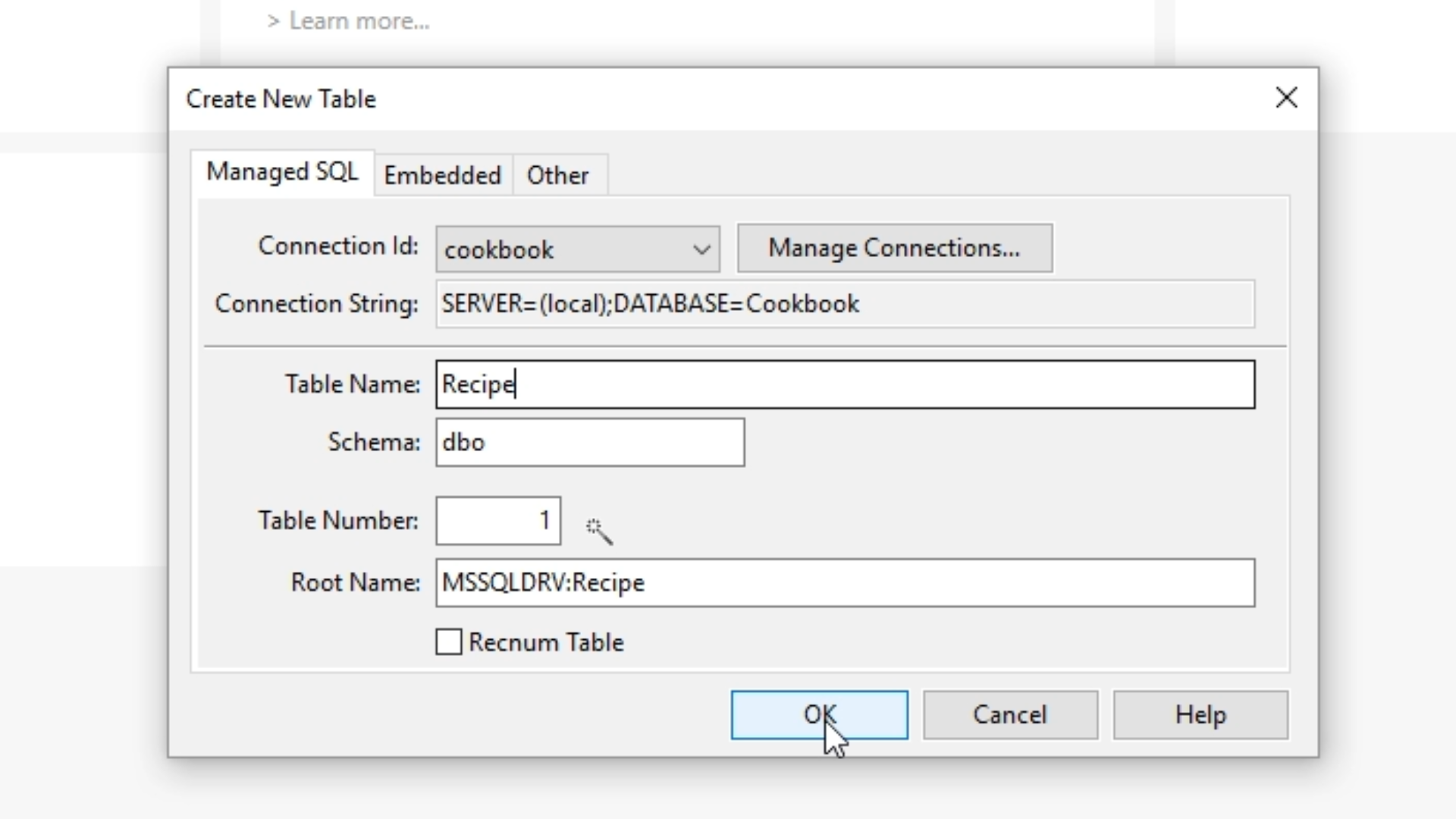 - Add a ‘Table Name.’ “Recipe” will be the name of this first table. Select ‘OK.’