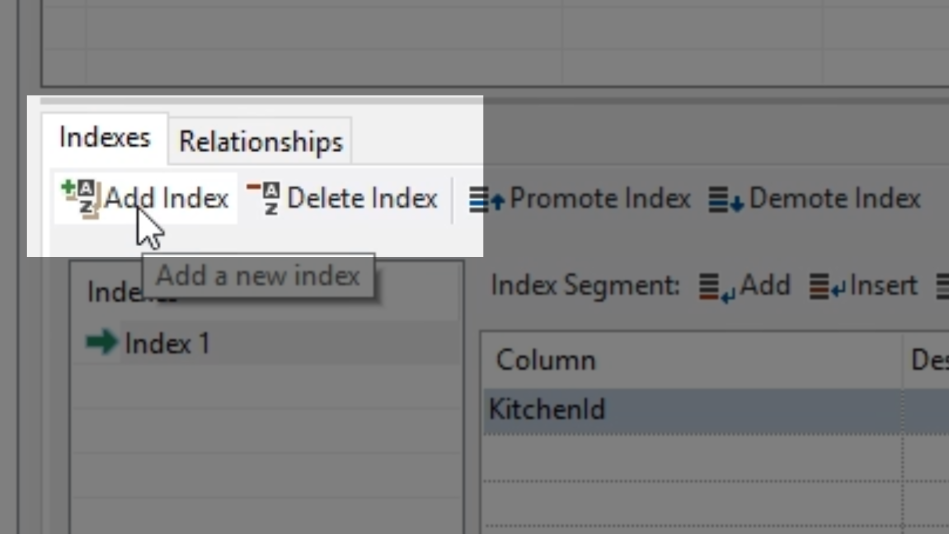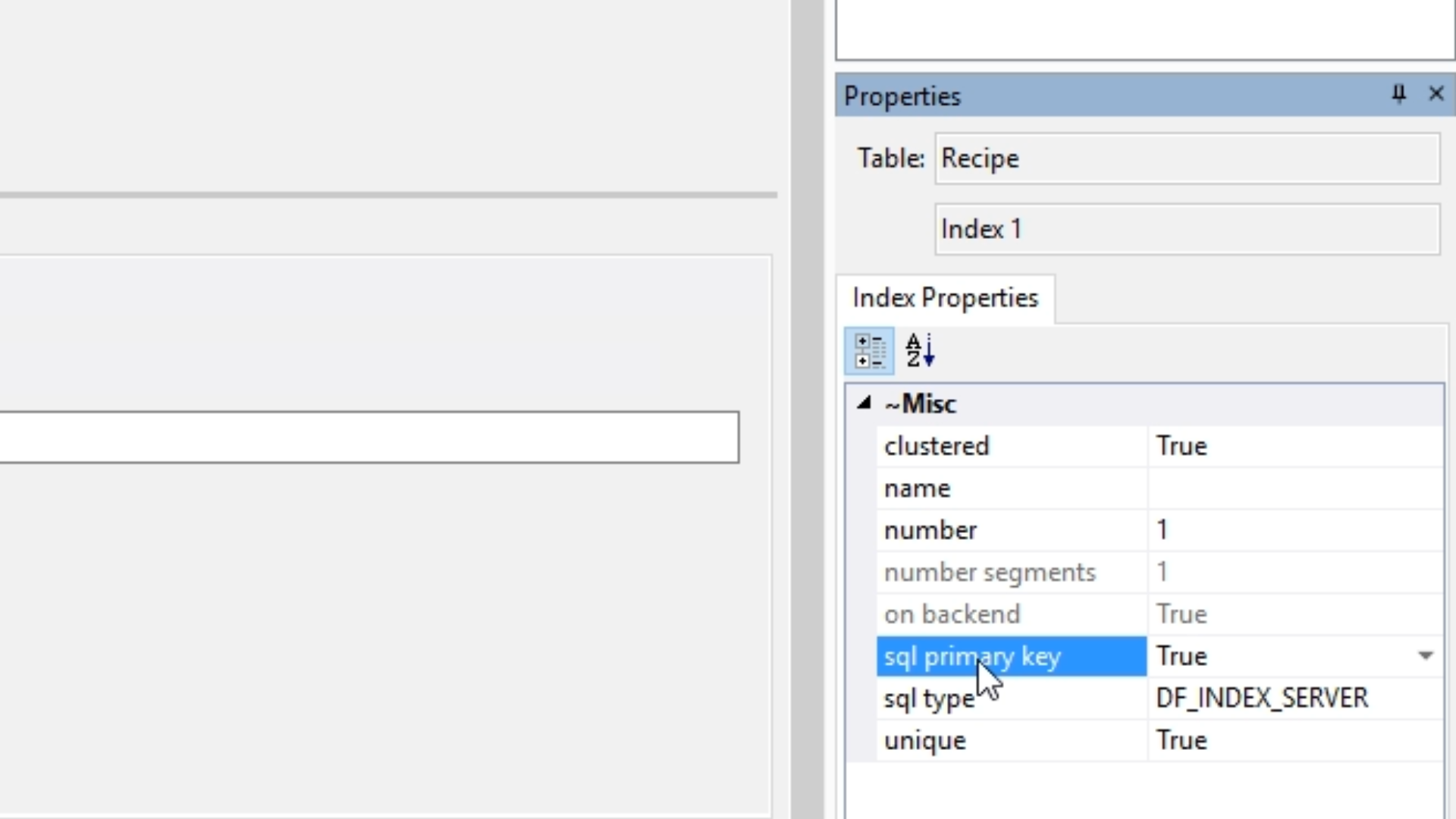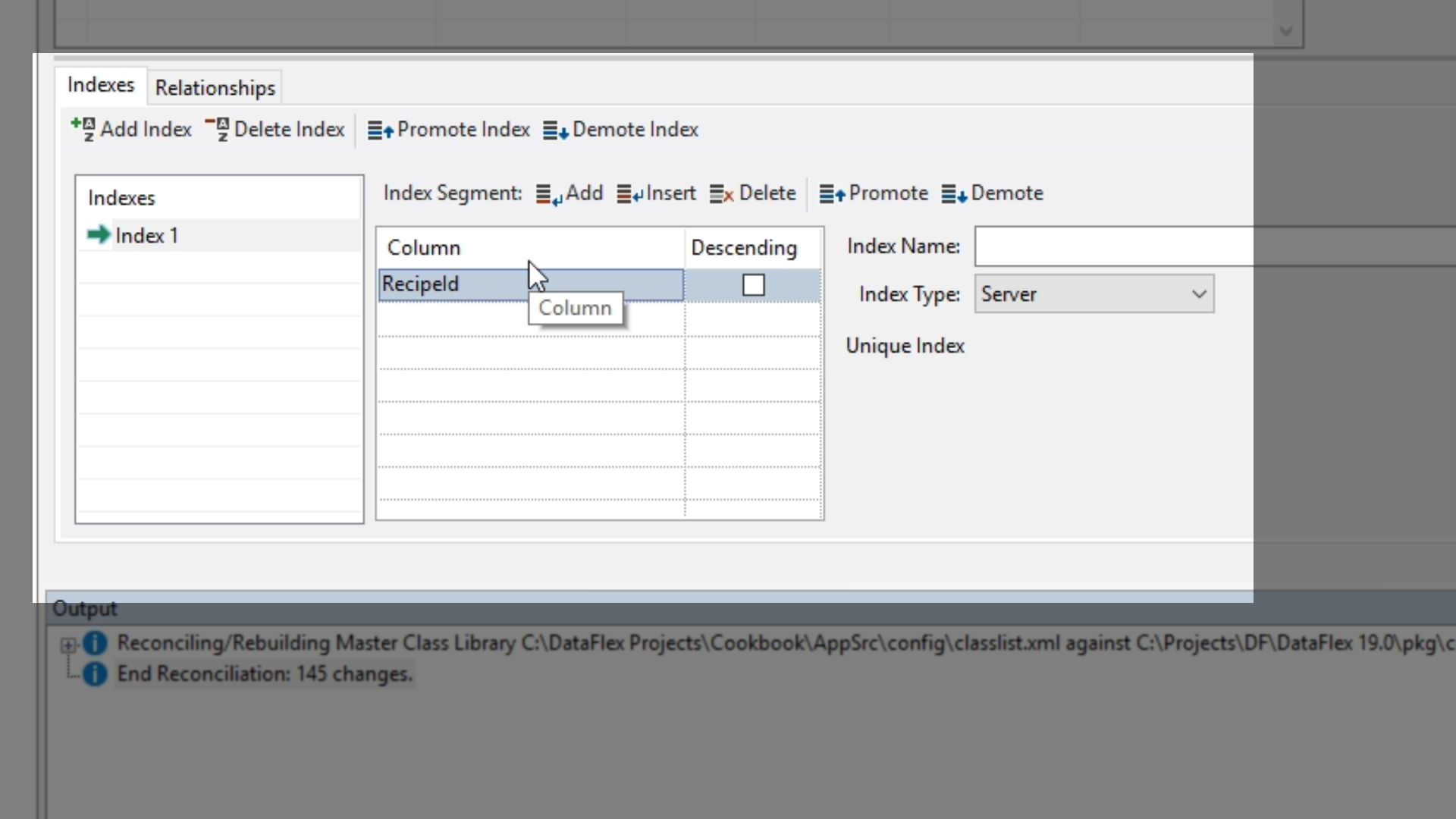 - ‘Index 1’ is automatically added to the ‘Indexes’ list, and ‘RecipeId’ is added to the column list making it a unique index.
