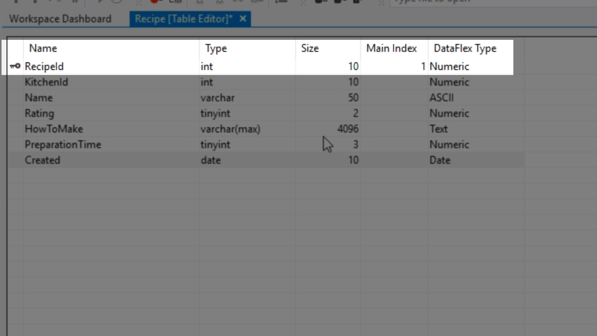 - FIELD 1 - Name: RecipeID, Type: int, Size: 10, DataFlex Type: Numeric