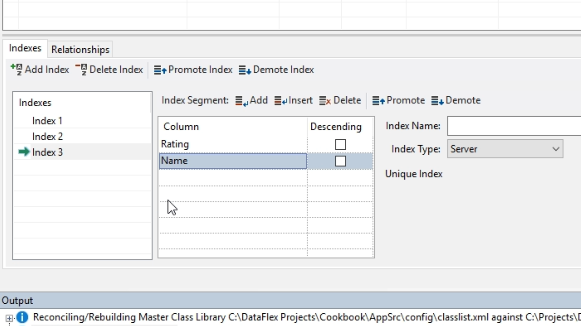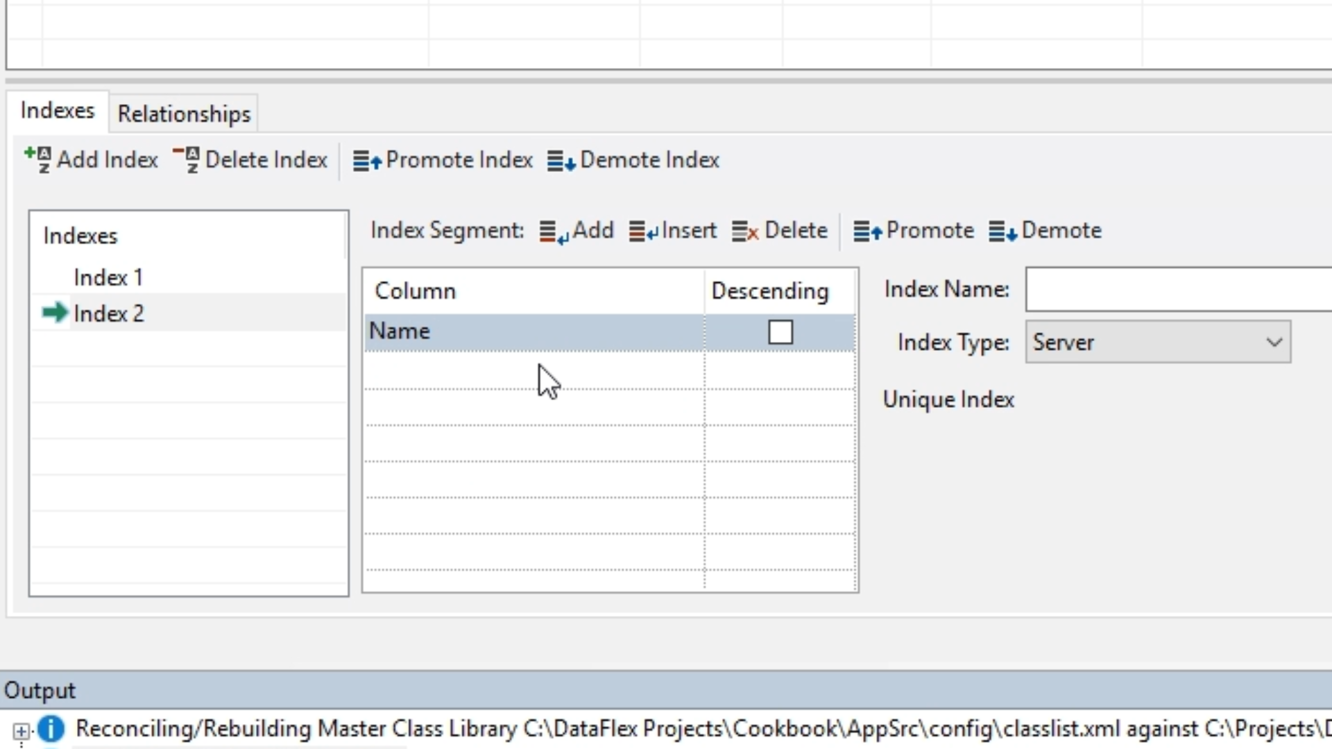 - Again, select ‘Add Index’ from the top of the panel creating ‘Index 2’, and select ‘Name’ for its column. This index will be sortable.