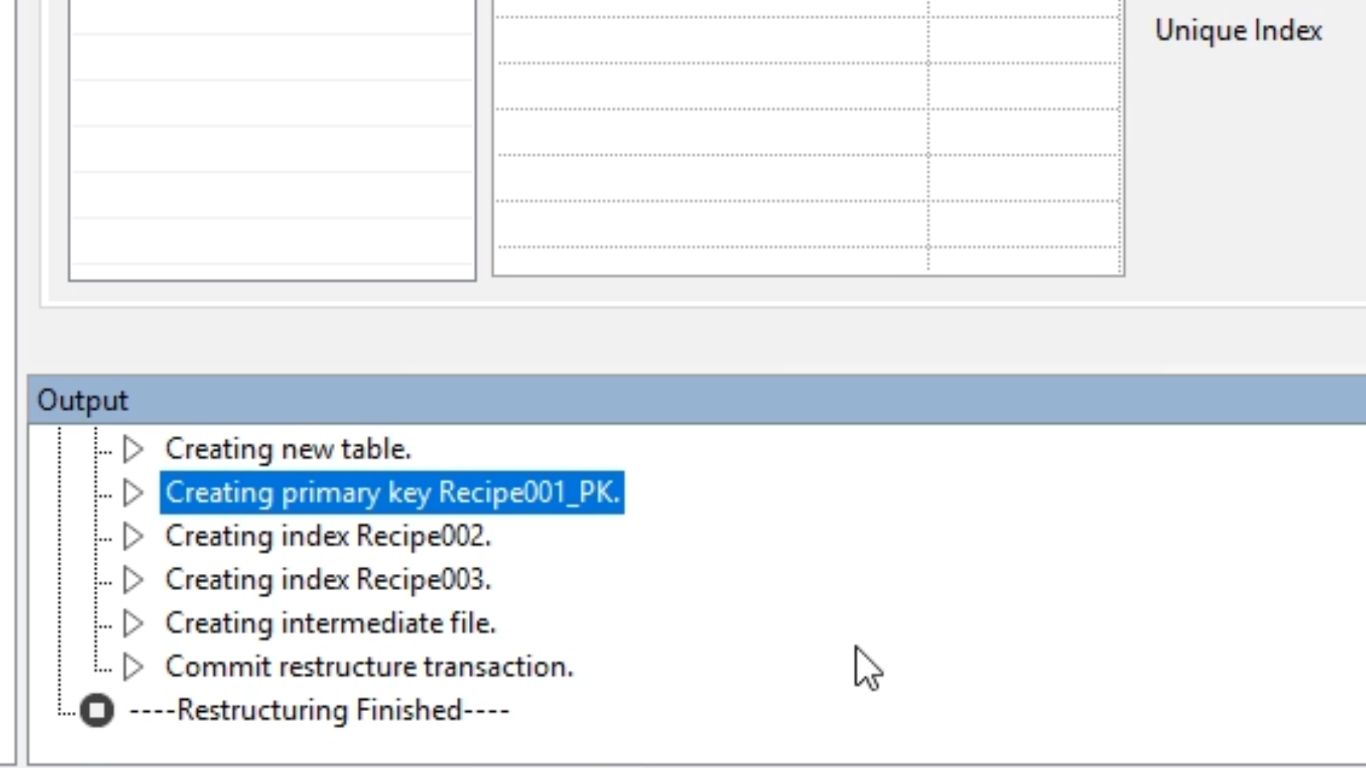 - The ‘Output’ panel at the bottom will show the creation of the table, the assignment of the primary key, the other indexes, and the intermediate file in the data folder.