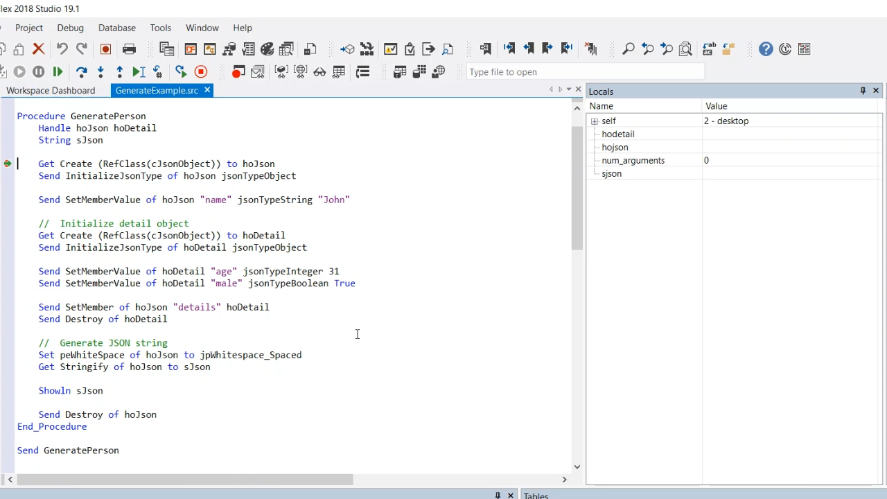 - The next step after parsing JSON is to generate JSON. Another sample, GenerateExample.src, will be used during this lesson.