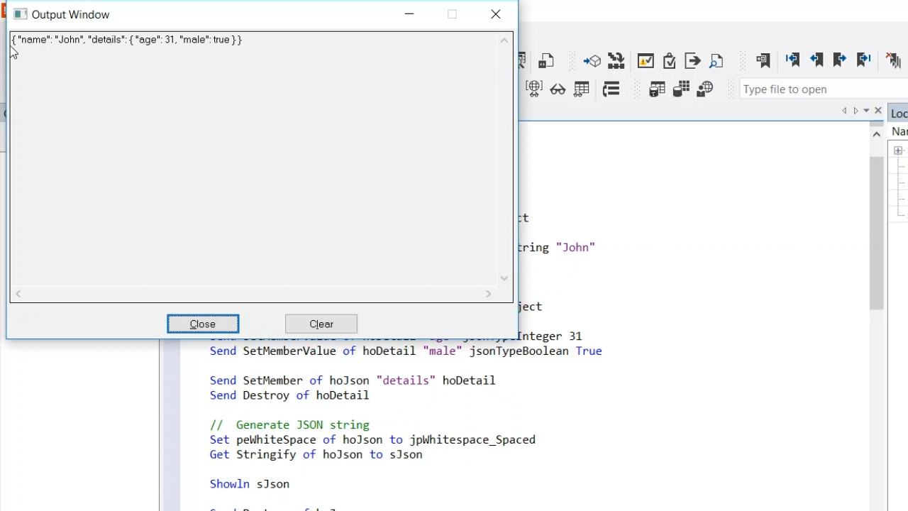 - Showln sJson shows the string containing the JSON. It contains the name and details (age:31 and male:true). That JSON is put in an output window, and then the last object, hoJson, is destroyed.