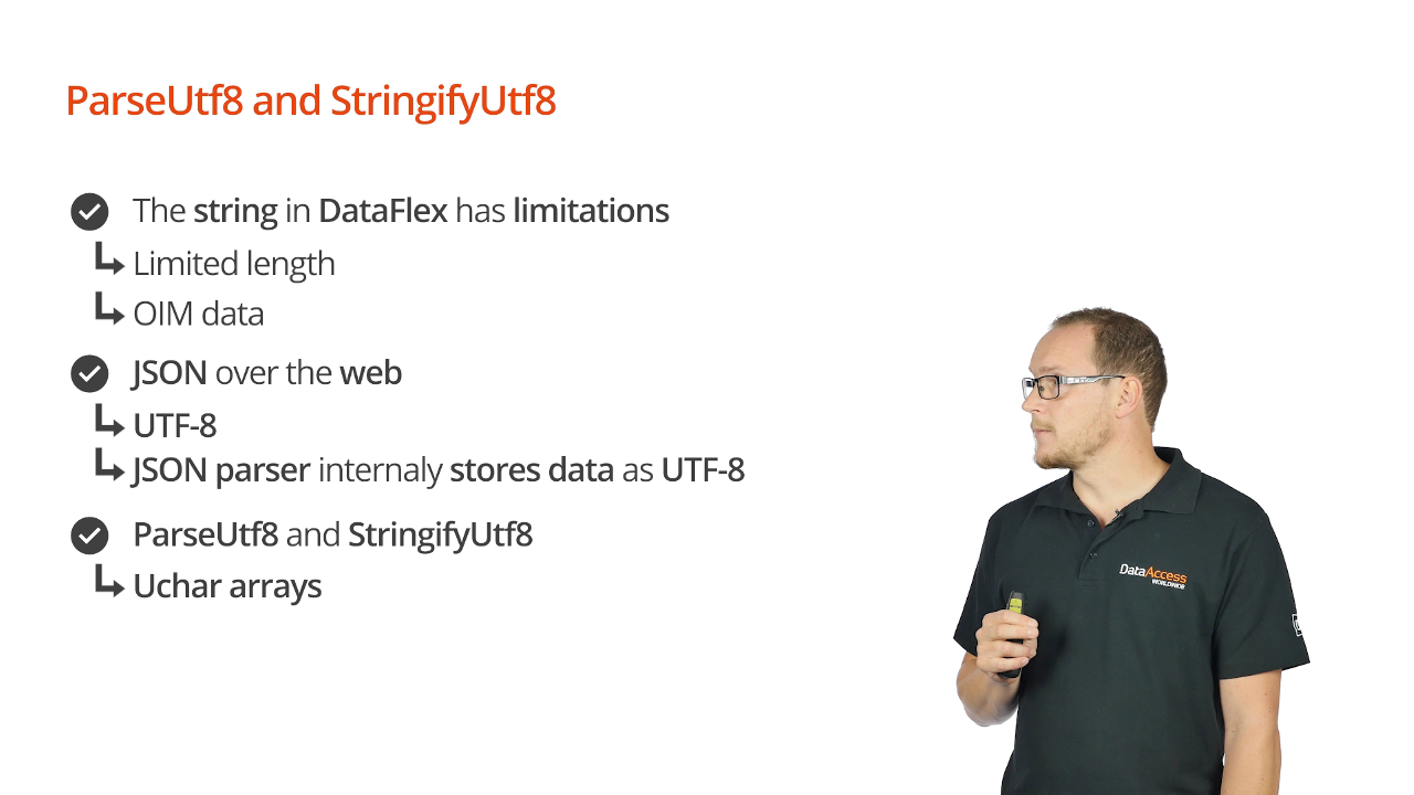 - Two APIs, ParseUtf8 and StringifyUtf8, have been added to allow larger pieces of JSON to be collected in the UTF-8 format. They return Uchar arrays, which support larger strings in DataFlex.