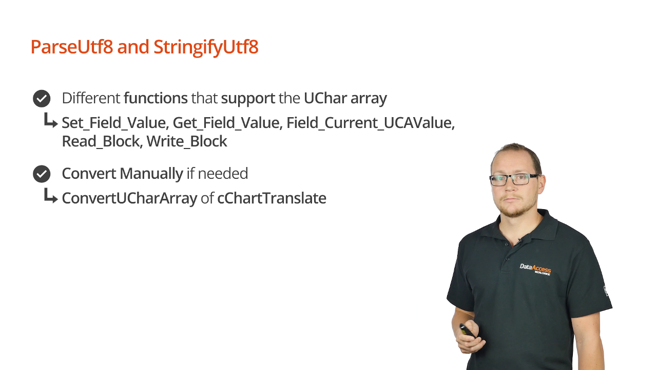 - Set_Field_Value, Get_Field_Value, Field_Current_UCAValue, Read_Block, and Write_Block are functions that support the UChar array.ConvertUCharArray of cChartTranslate can be used to translate it into different formats such as a variant string or a regular string.