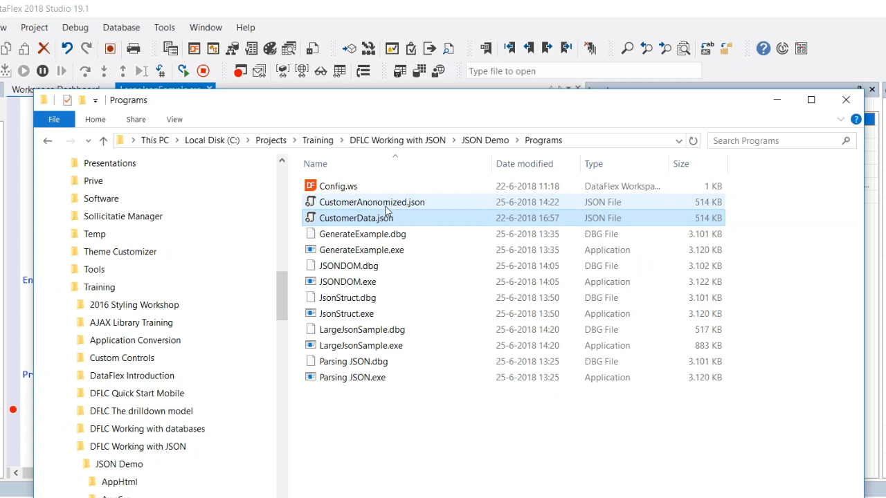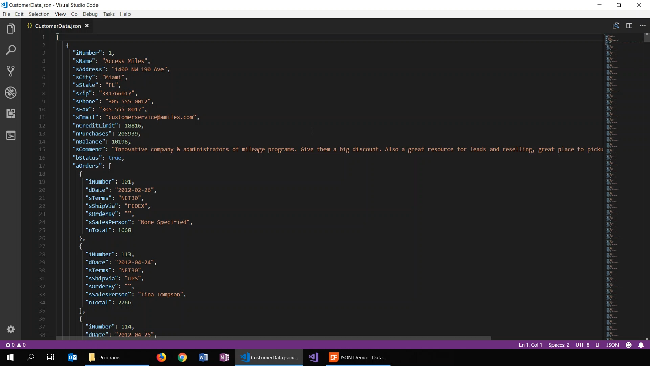 - The file used for this sample is called LargeJsonSample and contains source code and a file containing JSON called CustomerData.json. The large JSON file contains an array of customers and their order information.
