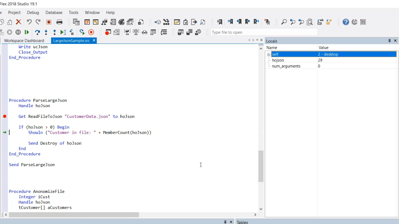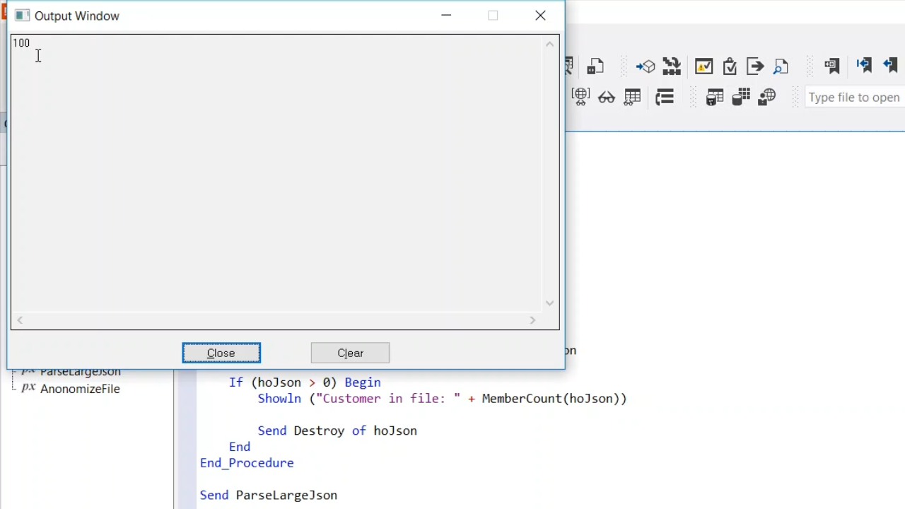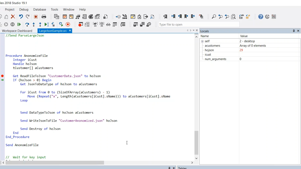 - The next sample procedure is called AnonomizeFile. The first step is to read in the file, which returns a JSON handle. Then JsonToDataType is called. Next, the JSON in memory is going to be converted into the tCustomer struct array. The array of customers shows that it has 100 elements (customers) in memory, and there is an array of orders for each customer.