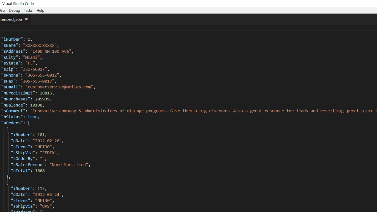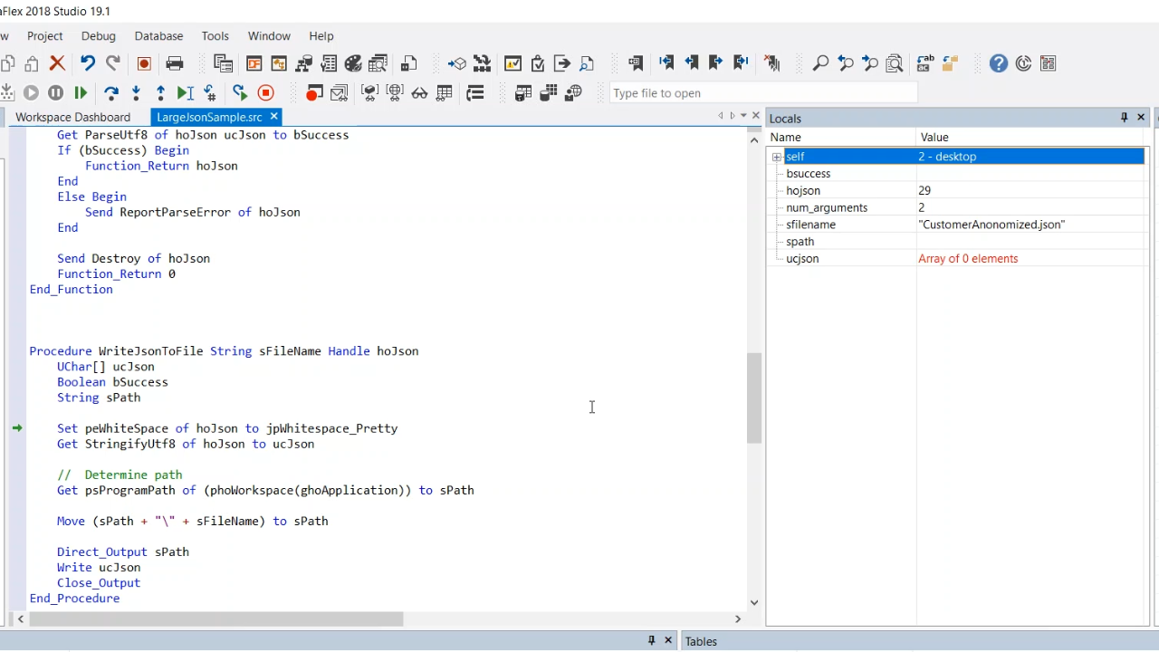 - Next the data will anonomized by replacing the customer name with xxxxxxxxxxx. All the data will be looped over to do so. The data is then converted back into JSON by calling DataTypeToJson (hoJson now contains the updated JSON), which basically throws away the existing JSON structure that the JSON handle holds. It generates the new JSON structure in memory that can be written out to a file with WriteJsonToFile that is being called with a parameter. Next, peWhiteSpace is set to jpWhtespace_pretty. StringifyUtf8 is called and will return a UChar array. This will all be outputted to a file using Direct_Output, Write ucJson and Close_Output.