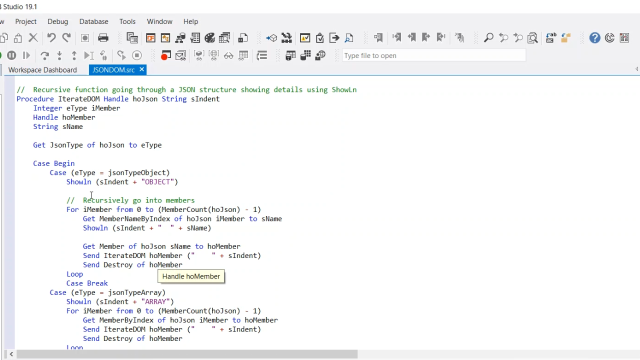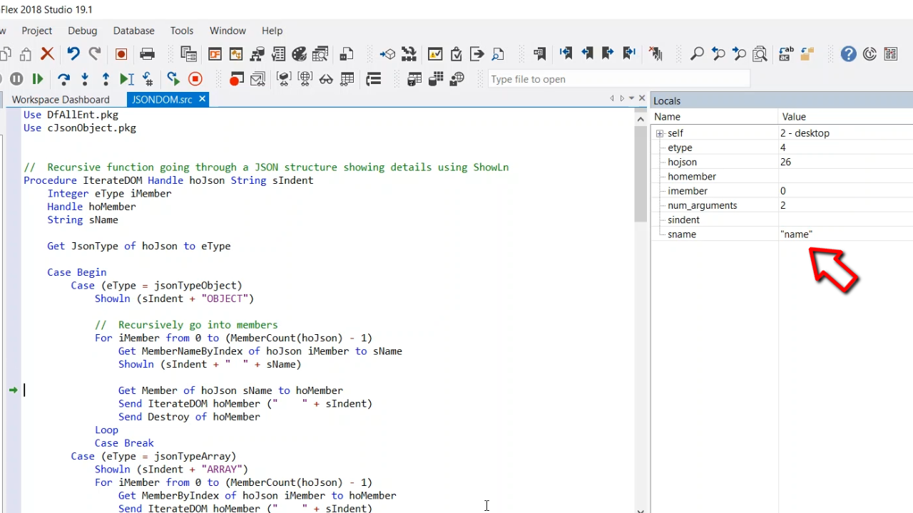 After that, the information will be called and parsed into a JSON string creating the hoJson object, which contains the initialize JSON. Then the IterateDOM function is stepped into that has the outermost object as its parameter. The jsonTypeObject is OBJECT, so the members of the object will be looped over. MemberCount is used to get the number of members, then the member names are retrieved using Get MemberNameByIndex which gets the name of the member. The first member is called “name.” Get Member is used to get the value of “name.” The function is the recursively called by going into IterateDOM again. hoJson then points to the member of type string. The JsonValue function is used to get the value of the member. In this case, hoJson points to a string type. The member value will be outputted to the window. hoMember is then destroyed.