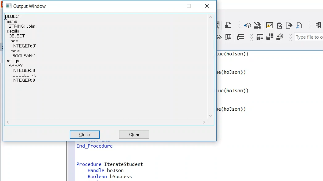 Going one level up in the recursive function, the next member is “ratings.” IterateDOM is called again. hoJson now points to an array, and it goes over the array members. Array members do not have names, so MemberByIndex is used to get the member by the index. A For loop is used that goes from zero to MemberCount - 1. For each member, InterateDOM is called. The members are of type DOUBLE. INTEGER will be used, however, if the number does not contain a decimal. When looped through again the next member in the array has a decimal, so it is of type DOUBLE.