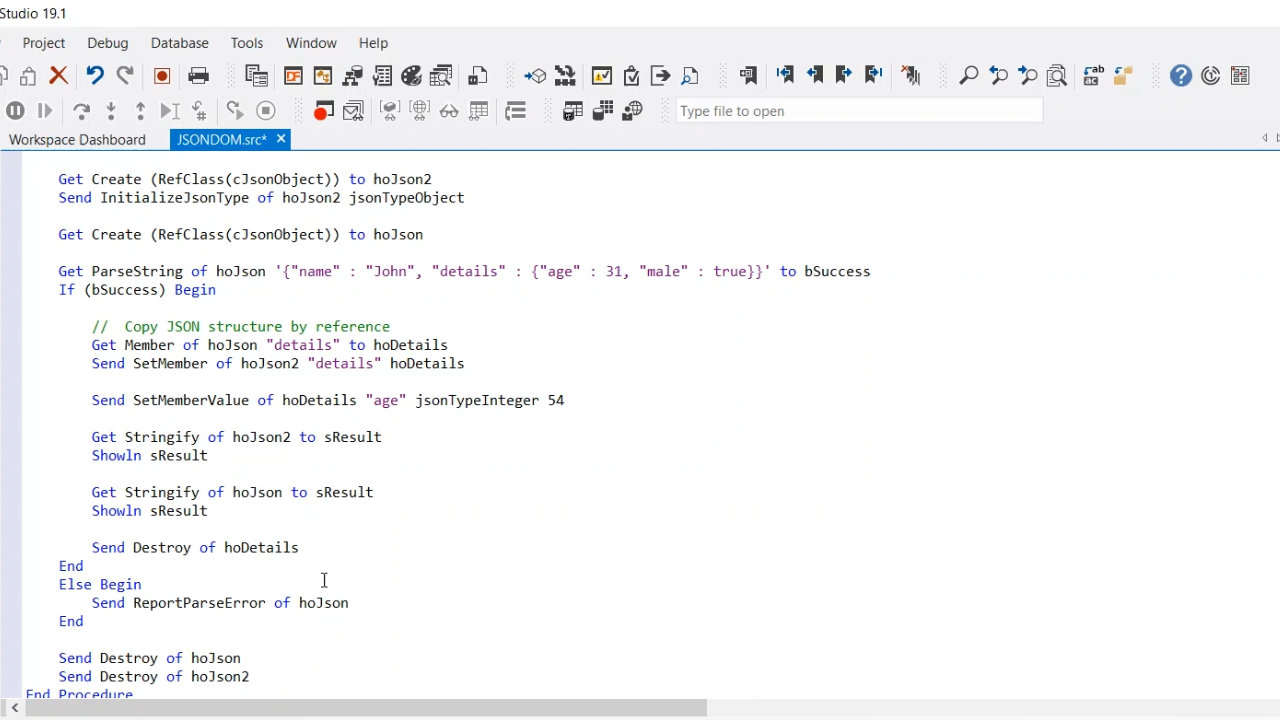 A member value is then changed. The “age” is changed to 54. Stringify is then used on hoJson2, and its value now shows the age changed to 54. Next, Stringify is used on hoJson, and it also now shows an age set to 54. This shows that it all works by reference. With Get Member a reference is retrieved for that member, and if the member is added to another JSON document or object a copy isn’t made in memory. A reference is just made to the other object. JSON objects can be part of multiple JSON documents. Changing one thing will change it in all locations. Both hoJson and hoJson2 need to be destroyed otherwise the details will remain in memory.
