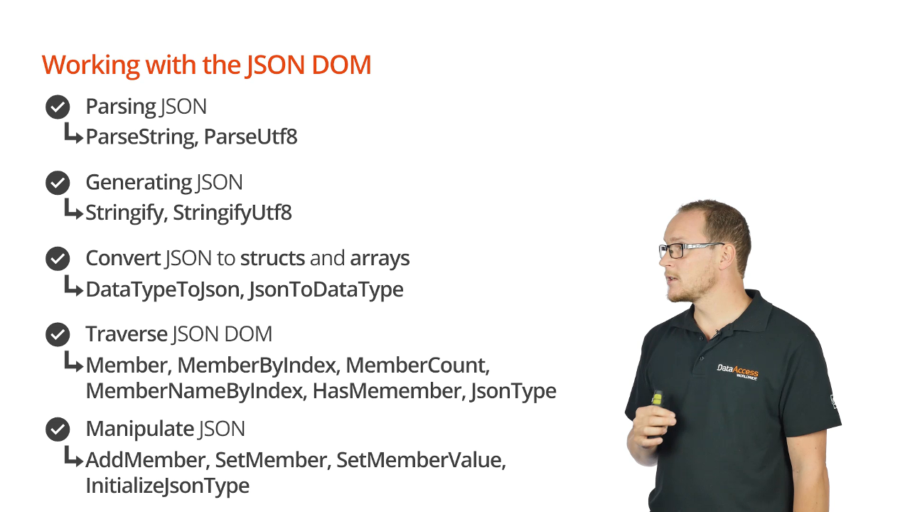 There are functions for parsing JSON: ParseString and ParseUtf8. There are functions for generating JSON: Stringify and StringifyUtf8. There are functions for converting JSON to structs and arrays: DataTypeToJson and JsonToDataType. There are functions to travers JSON DOM when its in memory: Member, MemberByIndex, MemberCount, MemberNameByIndex, HasMember, JsonType. JSON DOM can also be manipulated with AddMember, SetMember, SetMemberValue, and InitializeJsonType.