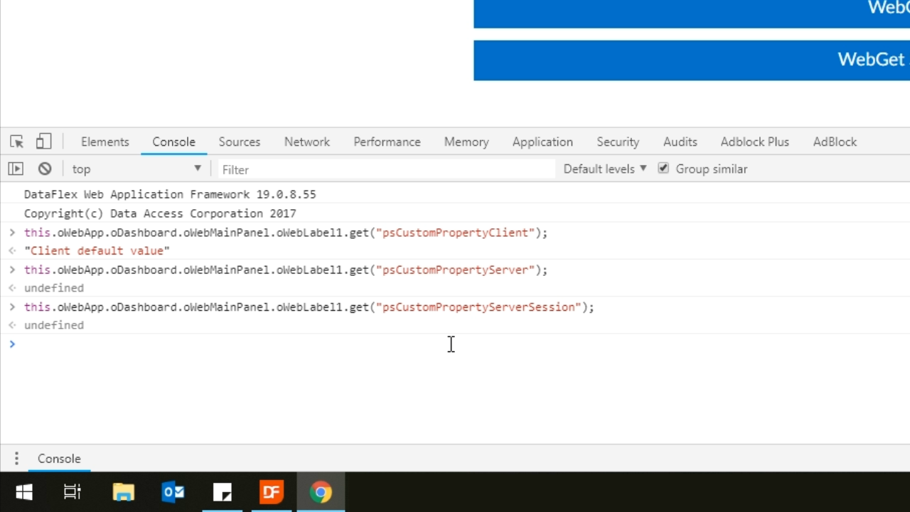 - Getting the value of ‘psCustomPropertyClient’ shows the default value. Doing the same for ‘psCustomPropertyServer’ and ‘psCustomServerSession’ will return an “undefined” value. This is because the values for Server and SessionServer WepProperties are kept in tables, which is much more secure.