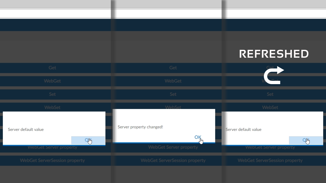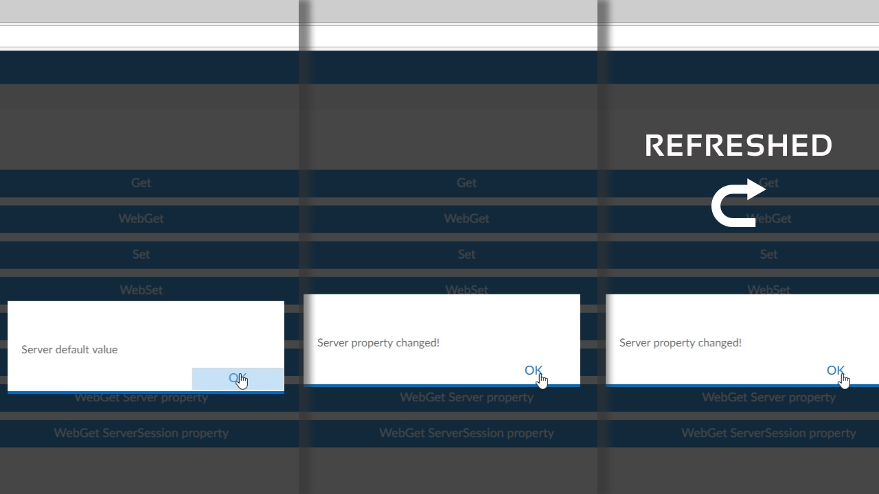 - Refreshing the page, and then selecting the ‘WebGet ServerSession Property’ button will continue to show the “Server property has changed” value. It remembers the values set during the session.
